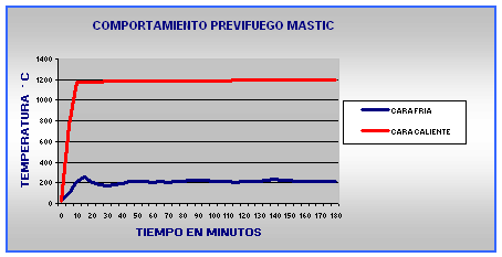PREVIFUEGOMRMASTIC fue analizado en pruebas de Resistencia de Fuego bajo los criterios de prueba para recubrimientos intumescentes de la Norma ASTM-E-119 de acuerdo con el método IMP-GTM-B-I-0001-1995 realizadas por Laboratorio Especializado certificado por ISO 9001: 2008 y utilizando el sistema de la Norma Mexicana NMX-C-307-1982 y que de acuerdo a los estándares de conducción de las pruebas, la temperatura en cara fria no debe rebasar 200° C, por lo que se considera que cumple los estándares de aceptabilidad bajo las condiciones de las Normas UL-263 y ASTM-E-119. Esta prueba consistió en aplicar PREVIFUEGOMRMASTIC a un espesor promedio de 19.7 mils, sobre una placa de acero al carbón de 40 x 40 cm. y 1/4" de espesor y se sometió a una flama a base de un quemador de gas butano durante 3 horas continuas a una temperatura promedio en cara caliente de 1,177°C (2,150°F) y alcanzada en un tiempo de 10 minutos y reportó una transmisión de temperatura en cara fría de 204°C. (400°F) medidos con termopares y con lector digital. Este valor es muy inferior a la temperatura que especifica la Norma IMP-GTM-B-I-0001-1995 (Cara caliente-Cara fria) que no debe rebasar 200º C. Asi mismo, esta temperatura quedo muy por debajo de la temperatura de “Cedencia” del acero que es de +/- 300 °C y a la temperatura de “Colapso” en el acero de 538°C (1000°F) como valor promedio y de 649°C (1200°F) máximo.